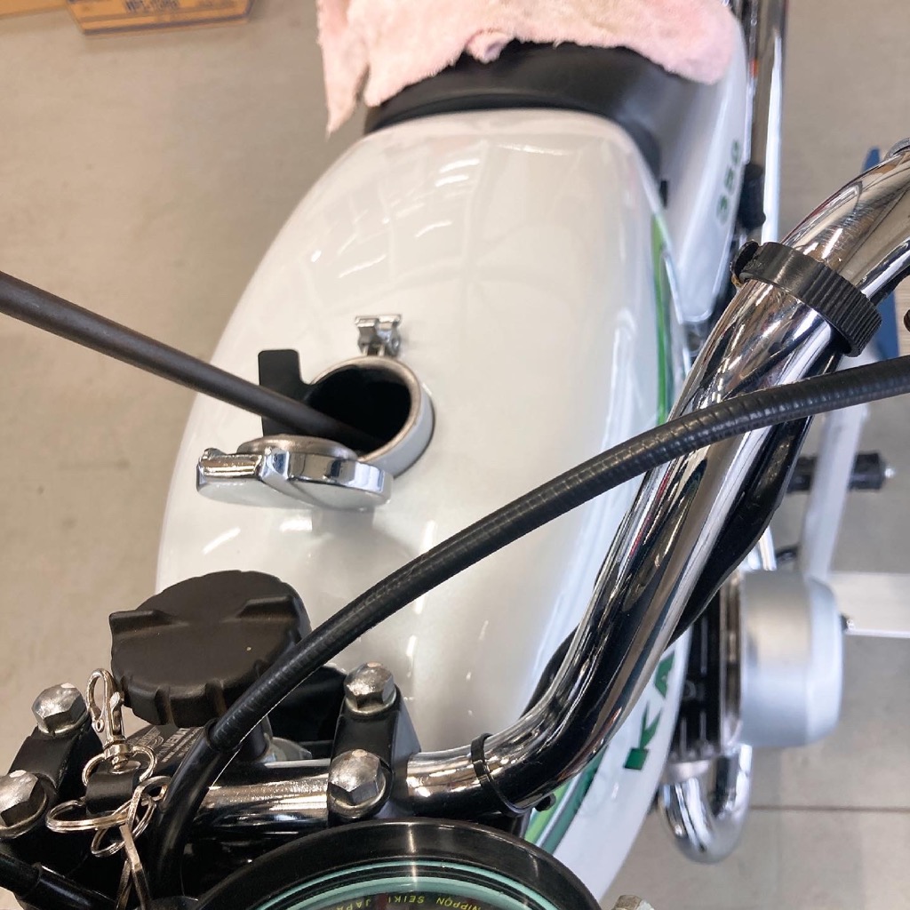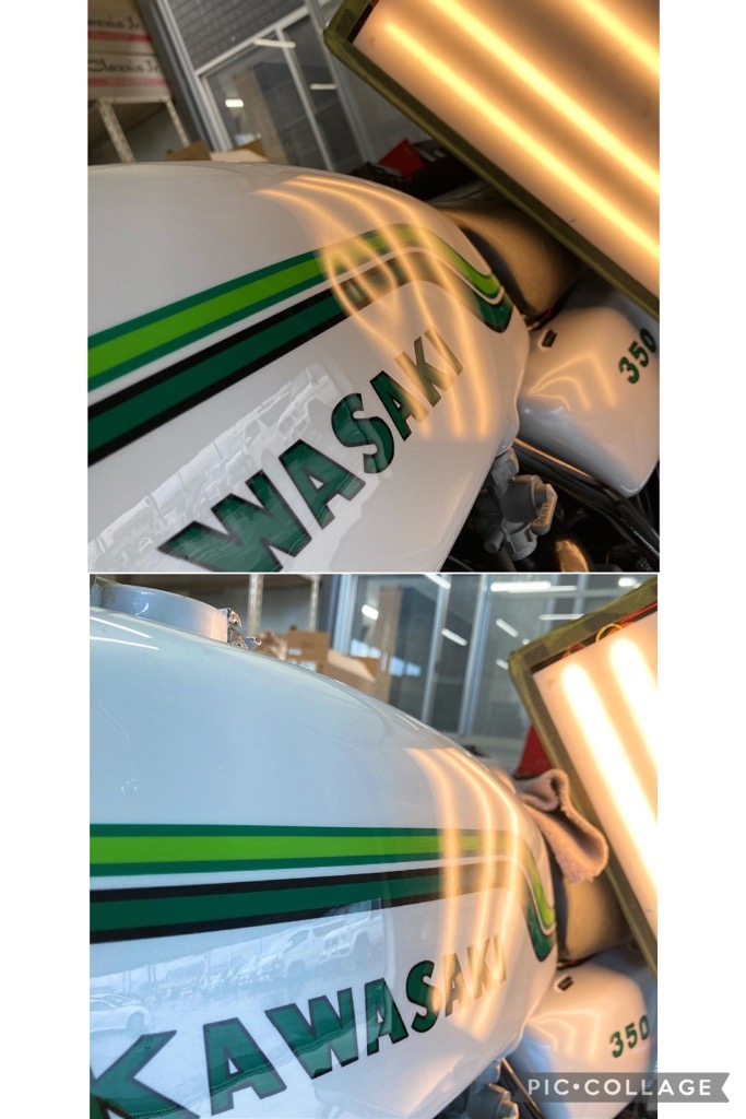 旧車のバイクタンクのへこみをデントリペアです。ステッカーが貼ってあるので板金塗装となると大がかりの作業です。塗装を割らないようにゆっくり押し出していきます。綺麗に直りました♪