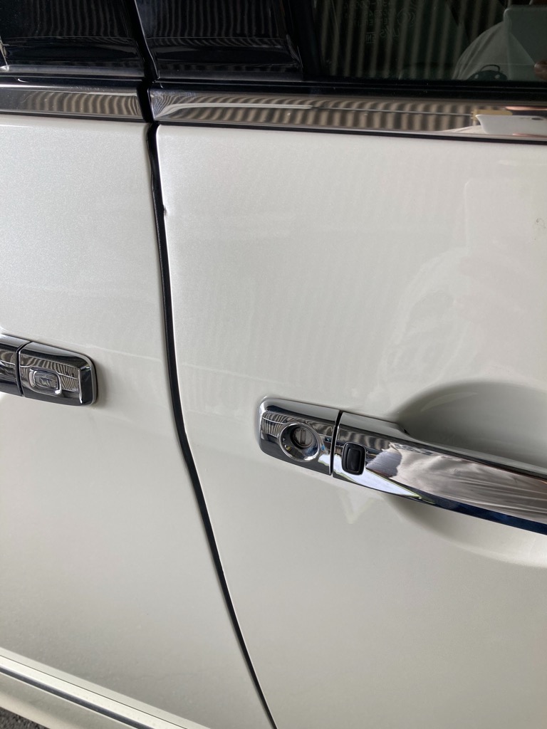富士市にてエルグランドのドア端を修理させて頂きました!塗装もかけていますがへこみの衝撃で出来た出っ張りも綺麗に直りました!サービスで錆止めとタッチアップもさせていただきました。塗装は一部欠けがありますが、板金塗装しなくてもここまで直ります!富士市の車のへこみ、飛び石修理は当店へぜひ一度ご相談ください♪